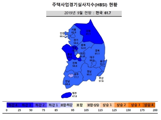 4일 주택산업연구원에 따르면 9월 전국 주택사업경기실사지수(HBSI) 전망치가 61.7로 전월대비 6.5p 하락하면서 올해 최저치를 기록했다.
