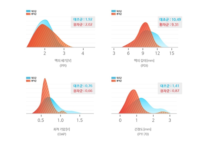 긴장된 맥파는 가압에 대한 저항력이 크게 나타나므로 가압 크기를 일정하게 증가시킬 때 최대 압맥파가 나타나는 시간은 짧아진다. 연구팀은 이러한 특성에 주목해 가압에 따른 맥파의 저항 구간을 긴장도(PTI, pulse tension index) 지표로 정의해 정량화했다. 그 외에도 최적 가압(OAP)과 맥의 깊이(PDI), 맥의 세기(PPI)를 분석해 월경주기에 따른 월경통 환자군과 대조군 간의 맥파 지표들을 비교했다.