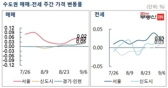 전세시장은 추석 전 수요 감소로 서울이 전주(0.04%) 대비 상승폭이 축소된 0.02%를 기록했다. 반면 신도시는 0.03%, 경기·인천은 0.01% 올라 지난주에 비해 오름폭이 다소 커졌다.