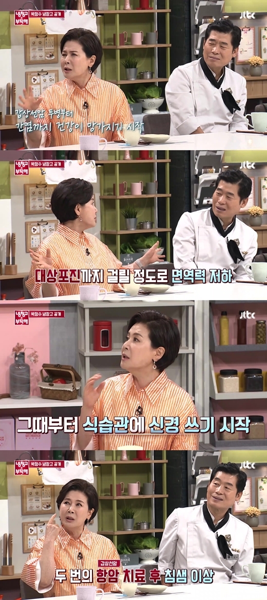 배우 박정수가 9일 오후 방송된 JTBC 예능프로그램 '냉장고를 부탁해'에서 과거 투병으로 힘들었던 시절을 밝혔다.