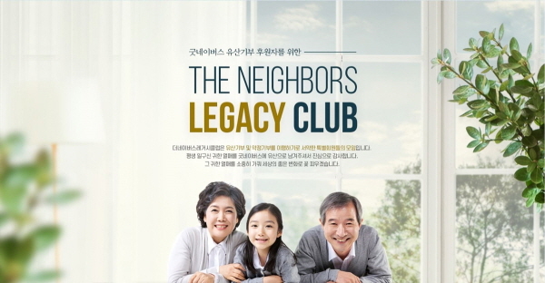 이들의 유산기부 공통점은 굿네이버스와 함께 진행되어 국내외 소외된 이웃을 위해 사용됐다는 점이다. 국제구호개발 NGO 굿네이버스(회장 양진옥)는 이러한 나눔을 확대하기 위해 유산기부자를 위한 ‘더네이버스레거시클럽’을 발족했다고 11일 밝혔다. 더네이버스레거시클럽은 유산기부 및 약정기부를 이행하기로 서약한 특별 회원들의 모임이다.