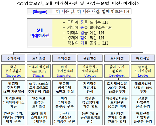 이와 함께 LH는 주거복지, 도시조성, 주택건설, 균형발전, 도시재생, 해외사업 등 주요 사업부문별 비전과 10년 후 미래상을 설정했다. 내부토론, 컨퍼런스, 연구과제 등으로 그 구체적 실현방향을 모색해나갈 계획이다.