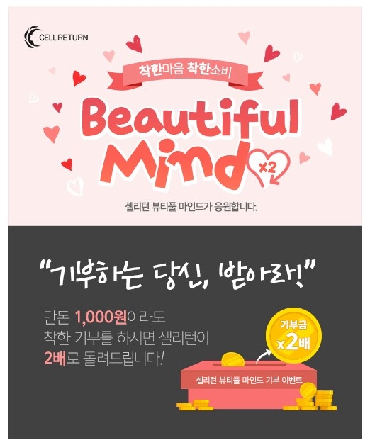 '뷰티풀 마인드'라는 이름의 이 캠페인은 누구나 쉽게 선행에 참여할 수 있도록 했다. 한국가이드스타에 등록된 사회복지, 환경, 동식물 보전, 유통, 지역개발, 주거/자원봉사 중 기관을 선택해 원하는 만큼 기부한 뒤, 기부 영수증을 받아 셀리턴의 홈페이지 내 이벤트 참여하기 버튼을 누르면 된다. 기부금액은 천원부터 가능하며, 셀리턴이 기부한 금액의 2배를 포인트백 해준다. 적립된 포인트는 셀리턴 구매 시 현금처럼 사용할 수 있다.