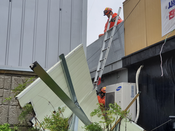 22일 태풍 타파로 인해 간판 등 시설물이 떨어져 있는 것을 울산소방 119구조대가 출동해 안전 조치를 하고 있다.