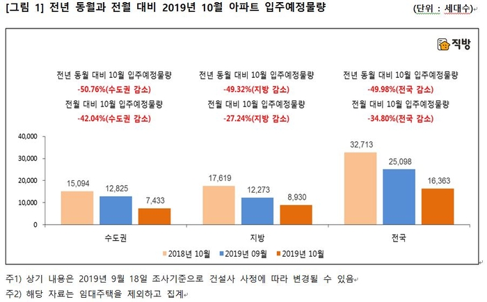 23일 부동산정보서비스 직방에 따르면 올해 10월 전국 아파트 입주예정물량은 1만6363가구로 지난해 10월 입주물량인 3만2713가구에 비해 49.98%가 감소할 것으로 예상된다.