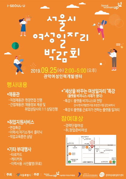서울시에서 지원하고 서울시여성능력개발원과 관악여성인력개발센터가 주관하는 여성일자리 박람회 ‘세상을 바꾸는 여성일자리’가 9월 25일(수) 관악여성인력개발센터에서 개최된다.