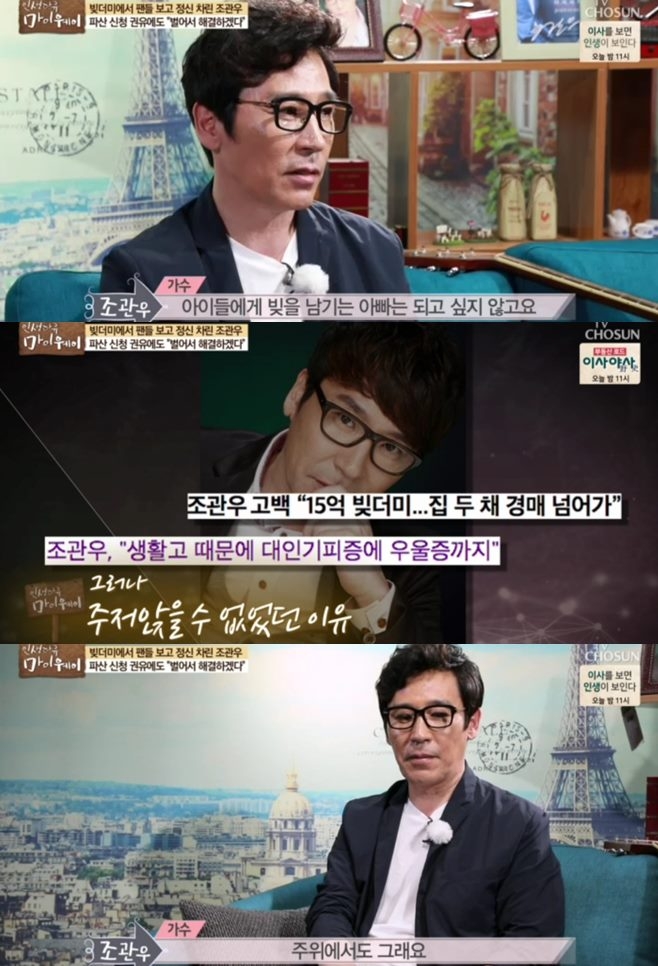 이날 조관우는 "현재 경매로 법원에 집 두 채가 넘어간 상태"라며 "카드를 사용 못 하고 있다. 카드든 뭐든 다 압류가 걸렸다"라고 말했다. 또 "주소지도 없고 떠돌이 생활을 하고 있지만, 빚을 남겨준 아빠는 되고 싶지 않다. 아이들을 생각하면 눈물이 난다"고 심정을 밝혔다.