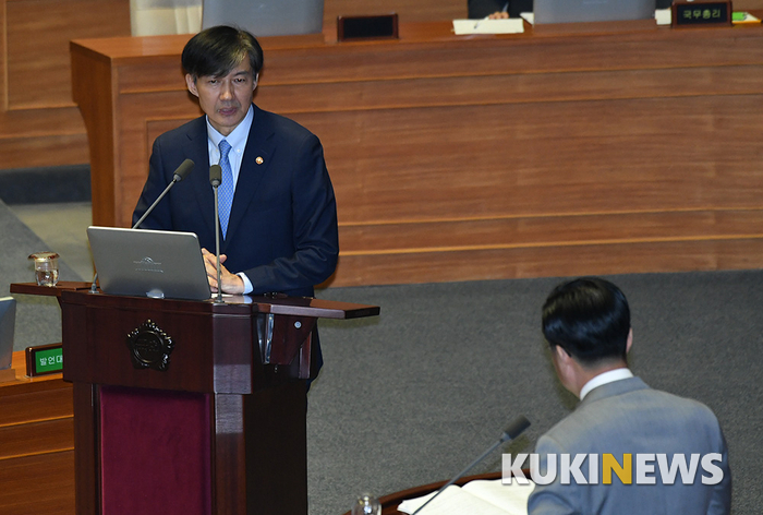 조국 법무부 장관이 26일 오후 열린 국회 본회의에서 바른미래당 이태규 의원의 정치 분야 대정부질문에 답변하고 있다.