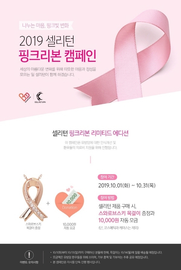 한편 ㈜셀리턴의 ‘핑크리본 캠페인’ 진행 기간은 10월 1일부터 10월 31일까지다.