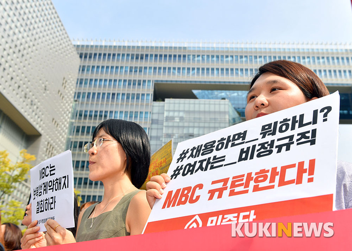 채용성차별철폐공동행동이 1일 오전 서울 상암동 MBC 본사 앞 광장에서 'MBC 아나운서 채용 성차별 실태 규탄' 기자회견을 열었다.