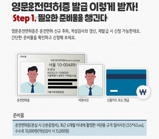 영문운전면허증은 운전면허 신규 취득, 적성검사와 갱신, 재발급 시 신청 가능하다. 준비물은 운전면허증, 최근 6개월 이내 촬영한 여권용 규격 컬러사진 등이다. 수수료는 1만원. 발급 신청은 전국 27개 운전면허시험장, 안전운전 통합민원 홈페이지, 경찰서 민원실에서 가능하다. 다만, 영문운전면허증으로 운전할 수 있는 기간은 국가마다 다르며, 대부분 3개월가량의 단기간만 허용하고 있다. 때문에 장기 체류할 경우 출국 전 대사관을 통해 사용 요건을 확인해야 한다.
