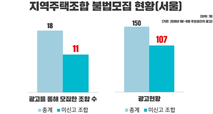 가장 많은 광고를 내며 조합원을 모집한 관악구의 A조합은 미신고 조합으로 지난해 10월 고발조치 당한 후에도 여전히 미신고 상태로 올해만 최소 69회 이상 광고 통해 조합원을 모집하고 있는 것으로 나타났다.