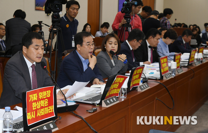 4일 오전 서울 여의도 국회에서 과학기술정보방송통신위원회의 방송통신위원회 등에 대한 국정감사가 열린 가운데, 자유한국당 소속 의원들이 한상혁 방송통신위원회 위원장의 사퇴를 촉구하는 피켓을 내건 채 국감에 임하고 있다.