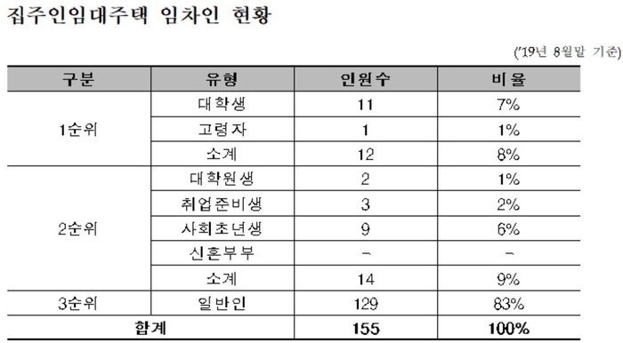 입주자 구성도 애초 사업취지와 거리가 있다는 평이다. 2019년 8월 기준 집주인 임대주택에 거주하는 입주자 155명 중 입주조건 1순위인 대학생은 11명, 고령자는 1명으로 총 12명에 불과했다.