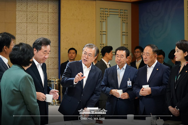 또한 문 대통령은 “노동시간 단축도 300인 이상 기업의 경우 비교적 성공적으로 안착한 것으로 보이지만 내년도 50인 이상 기업으로 확대 시행되는 것에 대해서는 경제계의 우려가 크다”며 “기업들이 대비를 위해 탄력근로제 등 보완 입법의 국회 통과가 시급하다”고 밝혔다. 이어 문 대통령은 당정 협의와 대국회 설득 등 조속한 입법을 위해 노력해줄 것을 당부했다.