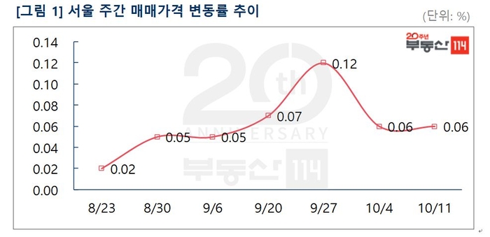 11일 부동산114에 따르면 이번주 서울 아파트값은 0.06% 올라 전주와 동일한 변동률을 나타냈다. 재건축이 0.08% 상승했지만 2주 연속 오름폭이 줄었다. 신도시와 경기·인천은 전주와 동일한 변동률로 각각 0.03%, 0.02%를 기록했다.