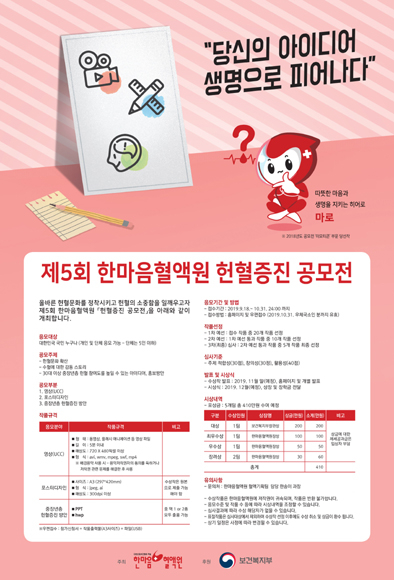 한마음혈액원은 올바른 헌혈문화를 정착시키고 헌혈의 소중함을 일깨우고자, 보건복지부 후원으로 제5회 헌혈증진공모전을 진행한다.
