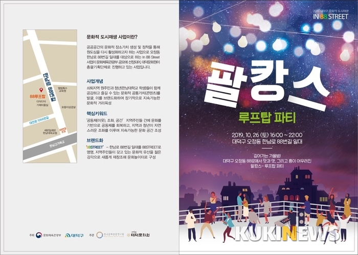 대전 대덕문화원은 오는 26일 오후 4시부터 오정동 한남로 88번길 15번지 옥상과 메인거리 일대에서 2019 대덕구 문화적도시재생사업 IN 88STREET '팔캉스–루프탑 파티‘ 를 개최한다고 17일 밝혔다.