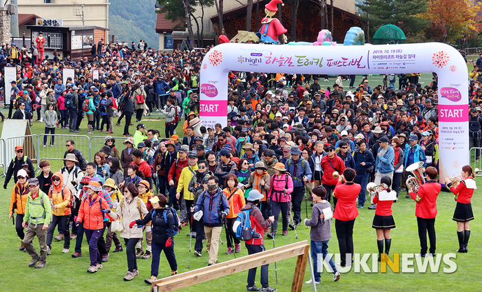 19일 오전 강원도 정선 하이원리조트에서 열린 '하이원 하늘길 트레킹 페스티벌' 참가자들이 힘차게 출발하고 있다. 2007년 부터 시작해서 올해로 13회를 맞는 이번 행사는 둘레길 코스, 고원코스, 무릉도원 코스, 운탄고도 코스 등 총 4개 코스로 운영되고 있으며 매년 많은 가족단위 참가들이 성황을 이루고 있다.