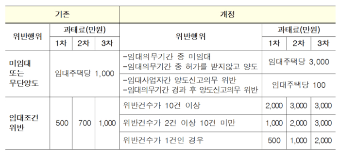 하지만 이번 시행령 개정을 통해 임대의무기간 중 양도 위반 시 3000만원의 과태료를 물어야 한다. 임대료 증액제한 등 임대조건 위반 시 위반 건수와 횟수에 따라 최소 500만원에서 최대 3000만원까지 과태료를 차등 부과한다.