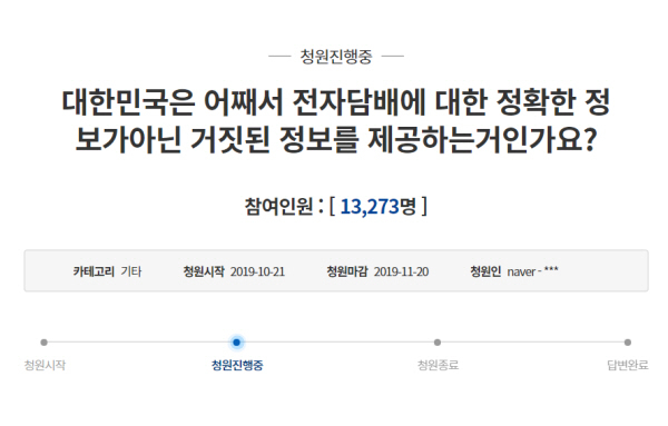이와 함께, 관련 국민청원에 1만 3천명 이상이 동의 의사를 밝히며 온라인으로까지 논란이 확산되는 모양새다. 청원 내용은, “미국 내 액상형 전자담배 이용으로 인한 폐질환 의심환자의 78%가 THC 전자대마, 물질이 함유된 액상 전자담배를 사용했다" 며 "마약 액상으로 인한 질병을 규제해야 하는 것으로 전자담배 전체의 규제는 부적절하다”는 주장이다.