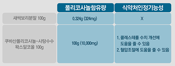 식약처의 인정을 받은 건강기능식품은 쿠바산 사탕수수의 잎과 줄기에서 순도 90% 이상 추출·정제한 ‘폴리코사놀-사탕수수왁스알코올’을 원료로 사용하면서 그 함유량(mg)까지 정확히 표기되어 있다.