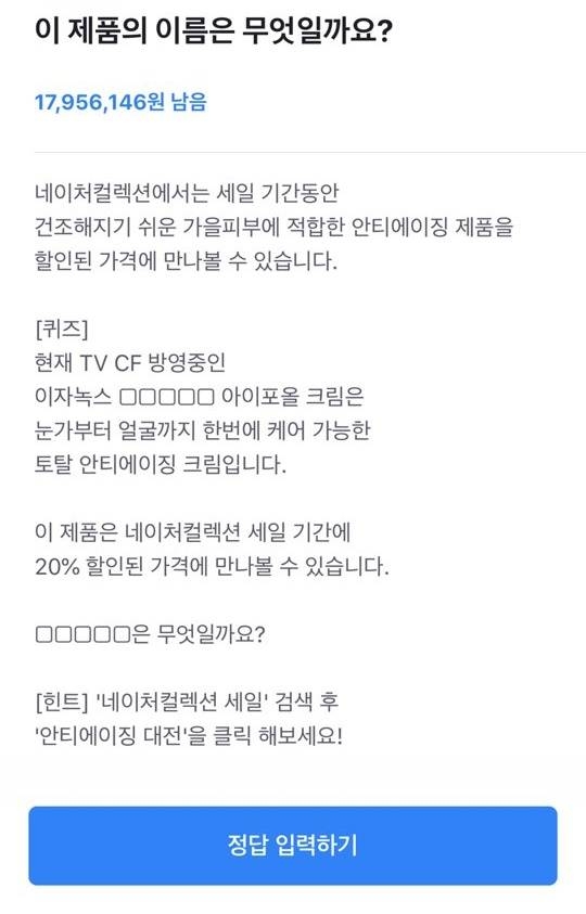 2일 토스 행운퀴즈 측은 ‘현재 TV 방영 중인 이자녹스 □□□□□ 아이포올 크림은 눈가부터 얼굴까지 한 번에 케어 가능한 토탈 안티에이징 크림입니다. □□□□□는 무엇일까요?’라는 문제를 냈다.