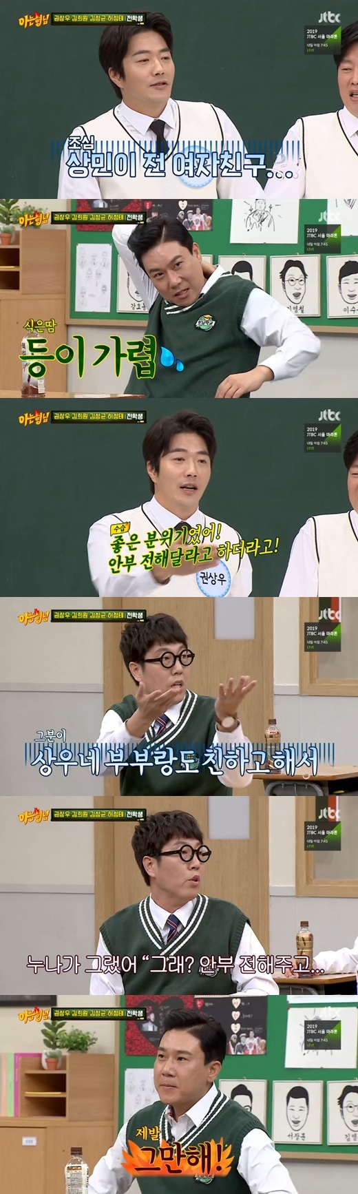 "누구랑 만났느냐"는 물음에 권상우는 "이상민의 전 여자친구와 밥을 먹었다"고 답했다. 그러면서 "좋은 분위기였다. 안부 전해달라더라"라고 덧붙였다.