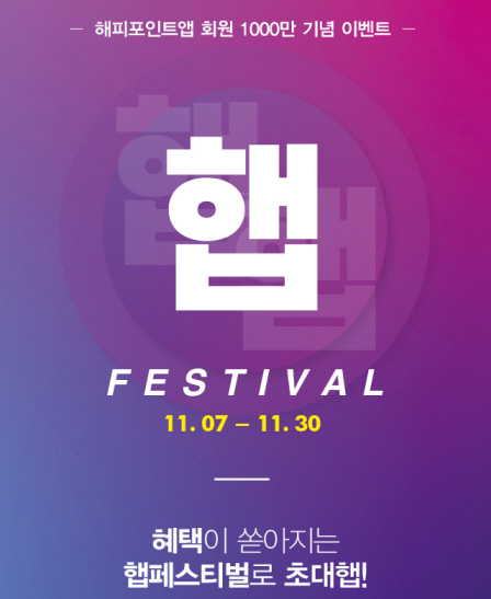 해피포인트에서는 모바일 앱 회원 1천만 달성을 기념해서 11월 한 달간 '햅페스티벌'을 개최한다고 7일 밝혔다. 해피포인트는 SPC그룹의 통합 멤버십이다.