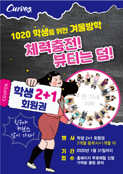 ‘30분 순환운동’으로 알려진 여성 피트니스 ‘커브스’가 겨울방학을 맞아 학생 2+1 회원권을 한시적으로 판매한다고 12일 밝혔다. 판매 기간은 오는 18일부터 내년 1월 31일까지다.