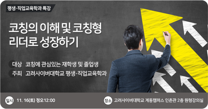 고려사이버대학교(총장 김진성) 평생·직업교육학과는 오는 16일(토) 오후 12시 서울 종로구 계동캠퍼스 인촌관 2층 원형 강의실에서 (사)한국코치협회 강용수 회장을 초청해 특강을 개최한다고 밝혔다.