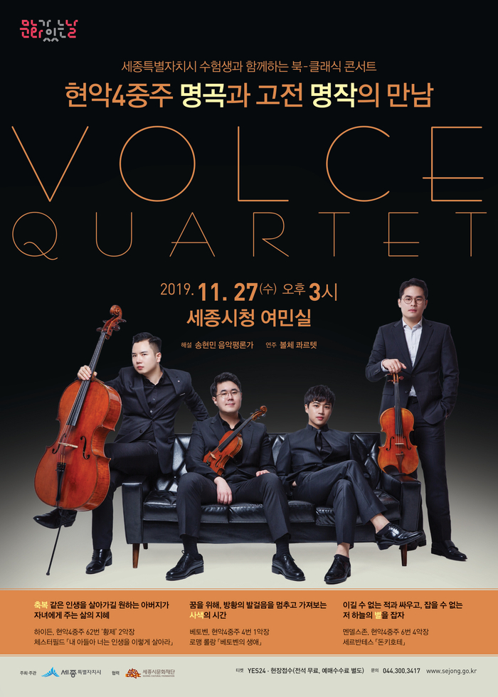 시가 주최·주관하는 이번 공연은 현안4중주 명곡과 고전 명작의 만남을 주제로 송현민 음악평론가의 해설과 함께 볼체 콰르텟의 현악4중주가 연주된다.