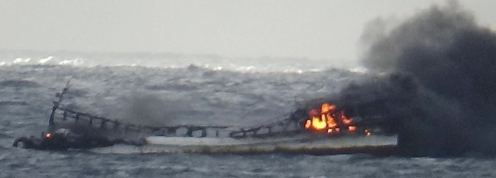 해경에 따르면 사고 당시 해역 수온이 19∼20도임을 고려할 때 생존 가능 시간은 24시간이다. 화재는 이날 오전 4시를 전후해 발생한 것으로 추정된다.