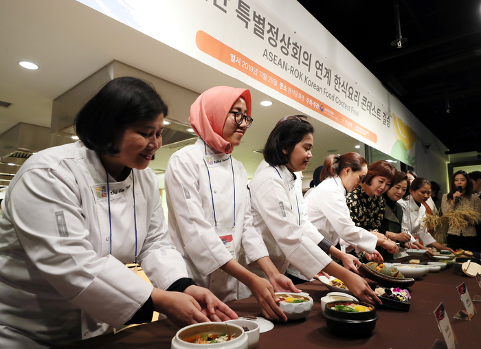아세안 8개국 참가자들이 26일 오전 서울 중구 한식문화관에서 열린 '한-아세안 특별정상회의 연계 아세안 한식요리 콘테스트 결승'에서 쌀로 만든 한식요리를 선보이고 있다.