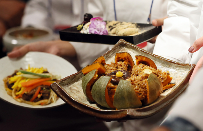 아세안 8개국 참가자들이 26일 오전 서울 중구 한식문화관에서 열린 '한-아세안 특별정상회의 연계 아세안 한식요리 콘테스트 결승'에서 쌀을 이용해 직접 만든 한식요리를 선보이고 있다.