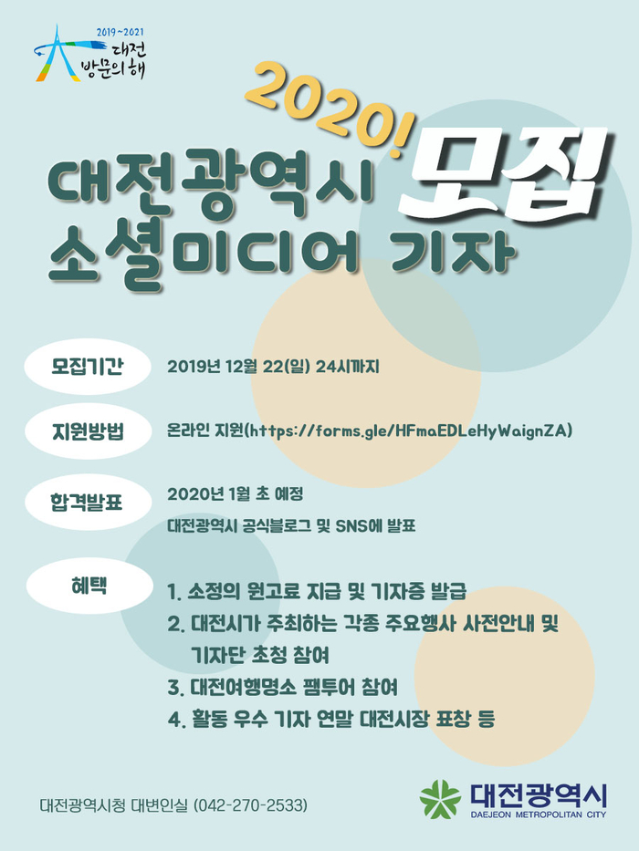 대전시가 2020 대전방문의해에 대전의 매력을 널리 알릴 ‘제11기 대전광역시 소셜미디어기자’를 모집한다고 3일 밝혔다.