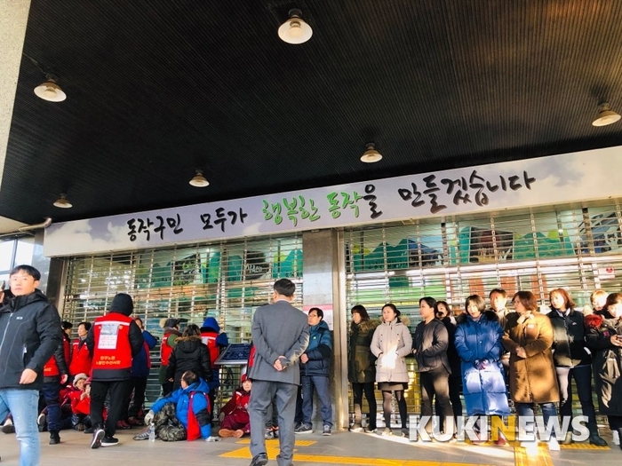 노량진 구 수산시장 존치와 생존권을 주장하는 상인들은 4일 오전 서울 동작구청 앞에서 집단 농성을 벌였다. 상인들은 이창우 청장과의 만남을 요구하며 생존권 사수를 주장했다.