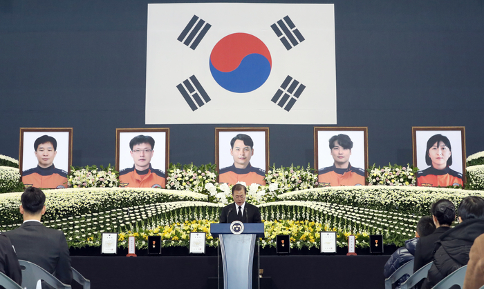 문 대통령은 이날 오전 대구 계명대 체육관에서 독도 해역 헬기 추락사고 합동영결식에 참석해 “다섯 분의 헌신·희생에 깊은 존경의 마음을 바친다”며 “소방관들의 안전과 행복을 지키는 것 역시 국가의 몫임을 잊지 않겠다”고 밝혔다.