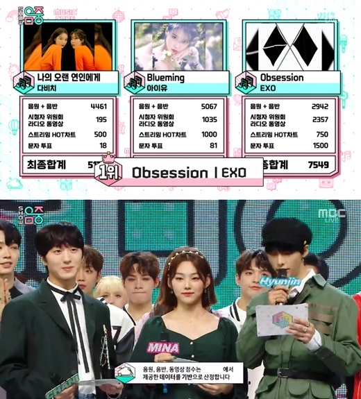 엑소는 이날 다비치와 아이유를 제치고 1위를 거뒀다.