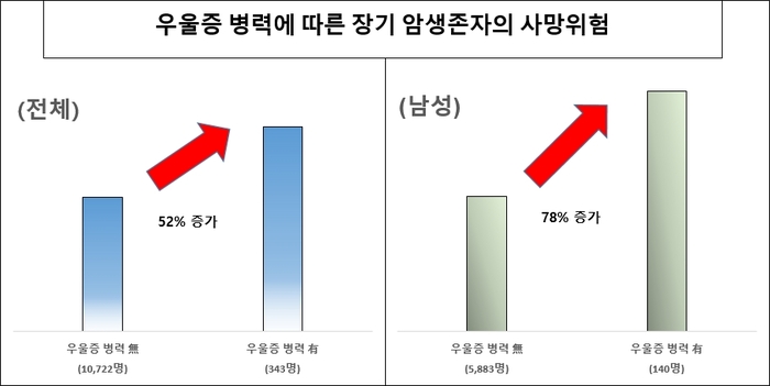 연구팀은 우울증 병력이 장기 암생존자 사망률에 미치는 영향을 분석했다. 결과에 따르면 우울증 과거력이 있는 장기 암생존자 343명은 그렇지 않은 장기 암생존자 10,722명에 비해 사망위험이 절반 이상 높았다. 이러한 경향은 남성이 더 두드러졌다. 남성 중 우울증 과거력이 있는 장기 암생존자의 사망위험은 그렇지 않은 경우에 비해 약 78% 높았다.