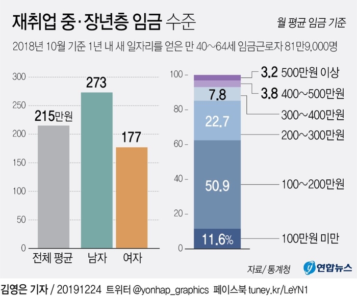 24일 통계청이 발표한 ‘2018년 기준 중·장년층 행정통계 결과’에 따르면 지난해 10월 기준으로 1년 새 일자리를 얻은 만 40~64세 임금근로자 81만9천명 중 62.5%는 월평균 임금이 200만원 미만이었다.