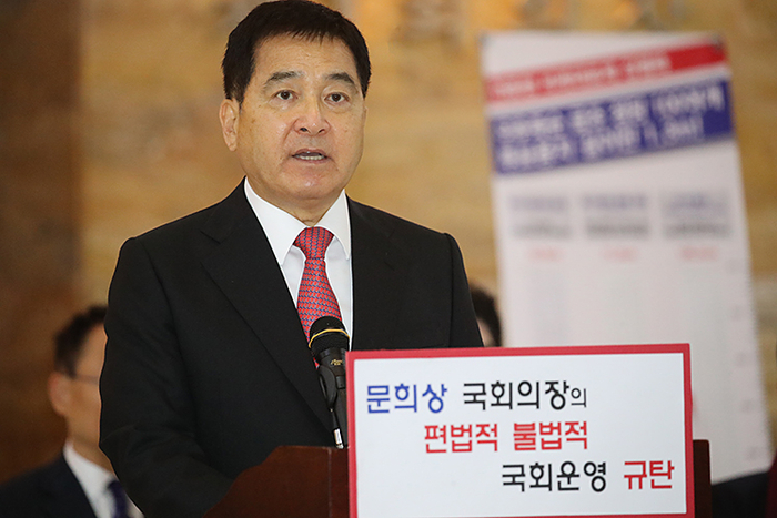 이와 함께 심 원내대표는 문희상 국회의장을 향해 “부끄러운줄 알라. 헌정사는 당신을 최악의 국회의장, 의회민주주의를 파괴한 의장으로 기록할 것”이라고 비난했다.