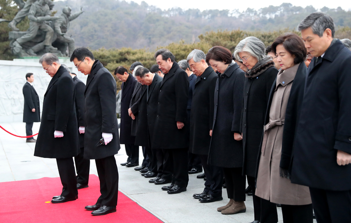 문 대통령은 이날 오전 8시 이낙연 국무총리를 비롯한 내각 장·차관들과 노영민 대통령 비서실장, 정의용 국가안보실장, 김상조 정책실장 등 청와대 참모진과 대통령 직속 자문기구 위원장 등과 함께 현충원을 찾았다.