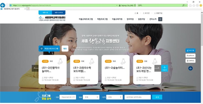 센터 홈페이지는 세종시 아동·청소년들이 여러 기관에 산재해 있는 체험과 마을 방과 후 교육정보를 쉽게 얻을 수 있고, 읍면동 주민자치프로그램도 별도 로그인 없이 신청할 수 있도록 구축했다(사진).