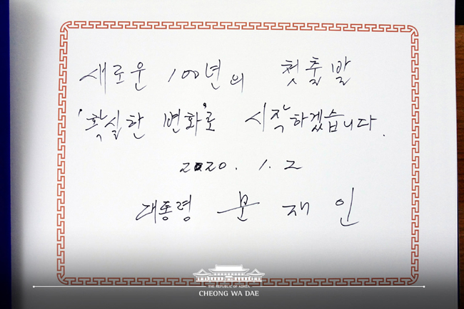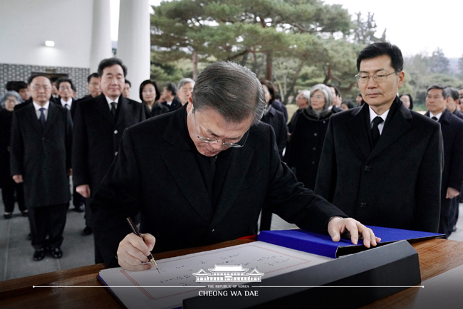 문 대통령은 현충탑에서 헌화한 뒤 묵념으로 순국선열들을 추모하고, 방명록에 “새로운 100년의 첫 출발 ‘확실한 변화’로 시작하겠습니다”라고 적었다.