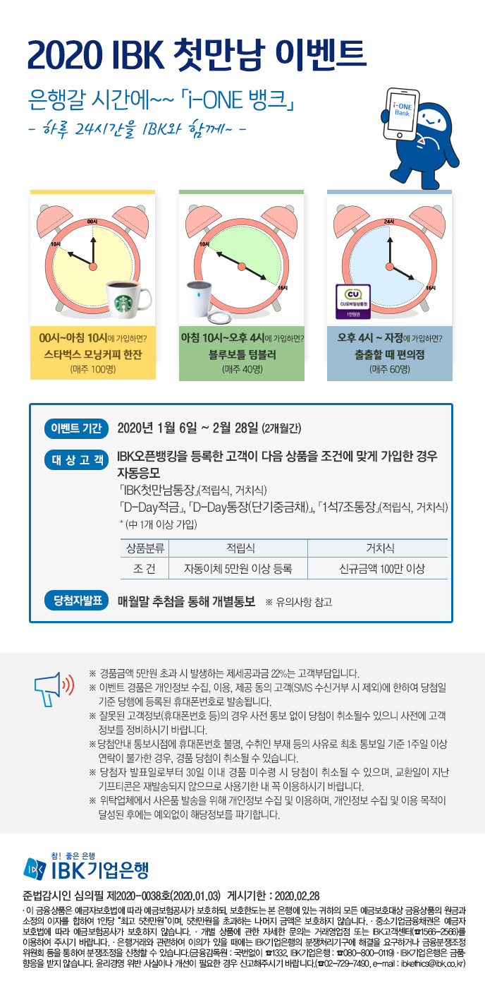 기업은행이 6일부터 ‘2020 IBK 첫만남 이벤트’를 시작한다. 인터넷·모바일뱅킹에서 IBK오픈뱅킹 서비스를 등록하고 비대면전용상품을 가입한 고객 중 적립식은 월 자동이체 5만원 이상 등록, 거치식은 신규금액 100만원 이상 고객에게 경품을 증정한다.