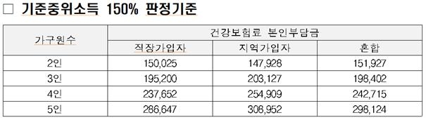 기준중위소득 판정 기준은 건강보험료 본인부담금을 통해 확인할 수 있으며, 본인의 건강보험료는 국민건강보험공단(☎1577-1000)에서 확인 및 조회가 가능하다.