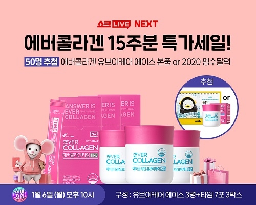 방송에서는 제품 판매 뿐 아니라 추첨을 통해 에버콜라겐 유브이케어 에이스 본품 또는 최근 인기인 ‘펭수’ 달력을 증정하는 이벤트가 함께 진행된다.