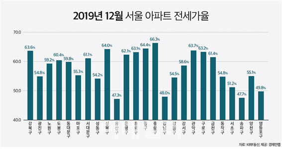 이 기간 아파트 전세가율이 가장 낮은 곳은 용산구로 47.3%를 기록했다. 반대로 최고치는 ‘중랑구’로 66.3%를 나타났다.