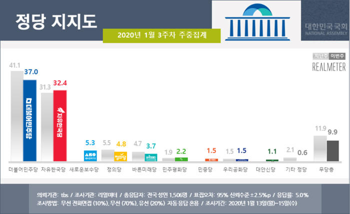 정당 지지율을 보면 더불어민주당이 지난주 1월 2주차 주간집계 대비 4.1%p 내린 37.0%로 40%대 초반에서 30%대 후반으로 급격한 하락세를 보인 것으로 조사됐다. 반면 자유한국당은 1.1%p 오른 32.4%로 다시 상승세를 나타내며 30%대 초반을 이어갔다.